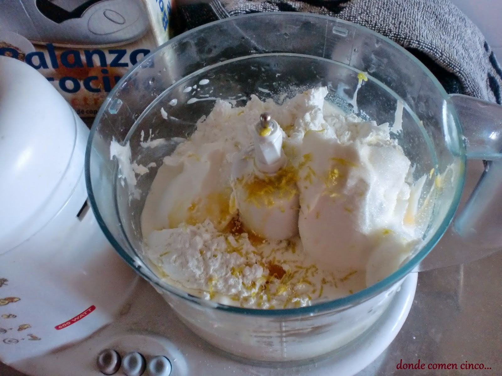 Ponemos en el vaso batidor las yemas con el azúcar y batimos un poco hasta q estén cremositas y luego añadimos el resto...el queso, la nata, la maicena y la ralladura de limón, entonces batimos todo junto(se puede perfectamente a mano) hasta integrar bien todos los ingredientes.