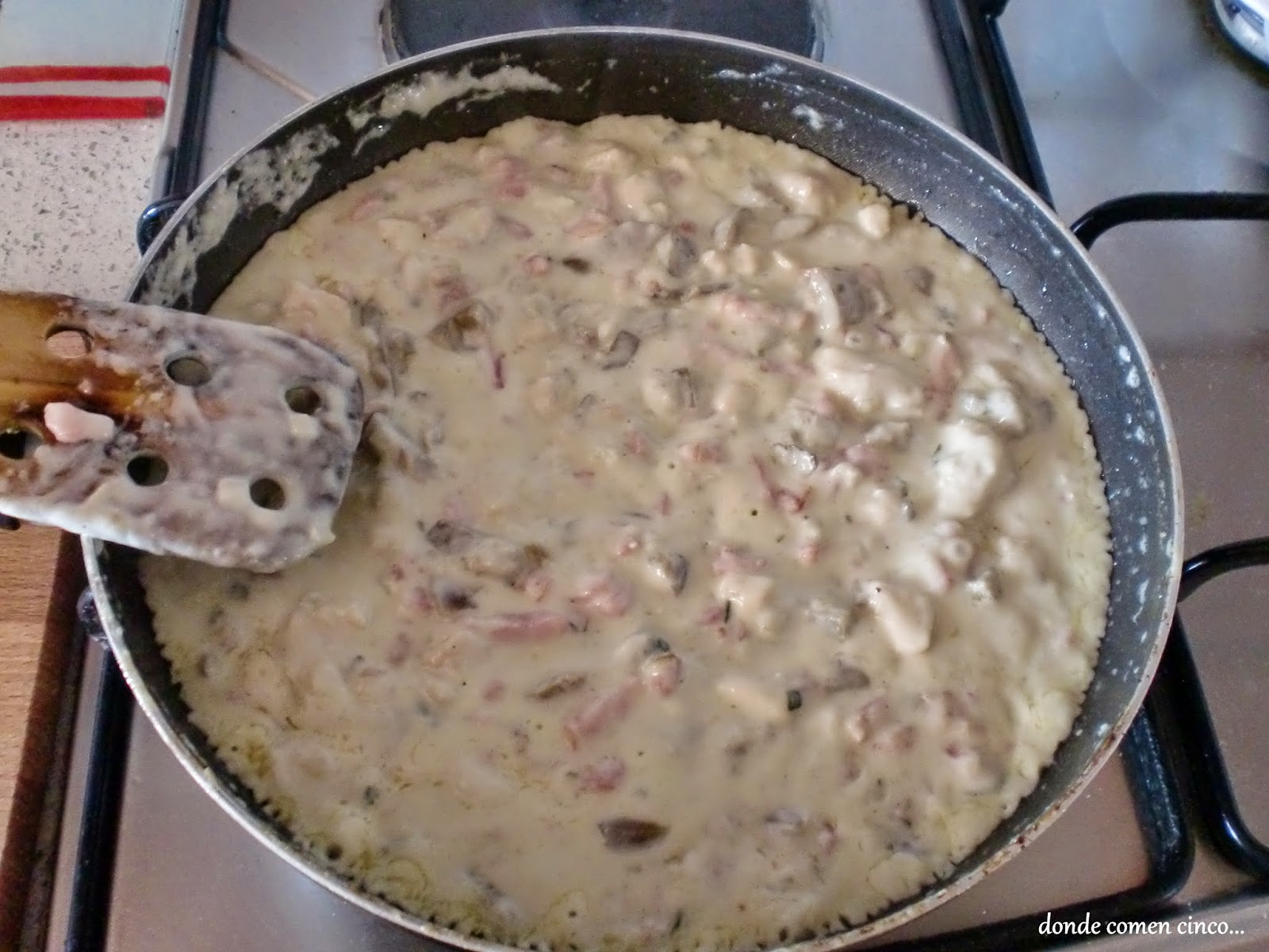 Ya tenemos listo el relleno para nuestros supersabrosos crepes, solo nos queda rellenarlos y si queremos reservamos antes de rellenar un poco de la salsita de nata que se ha formado con el sofrito y echamos por encima junto con un poco de queso rallado y gratinamos.